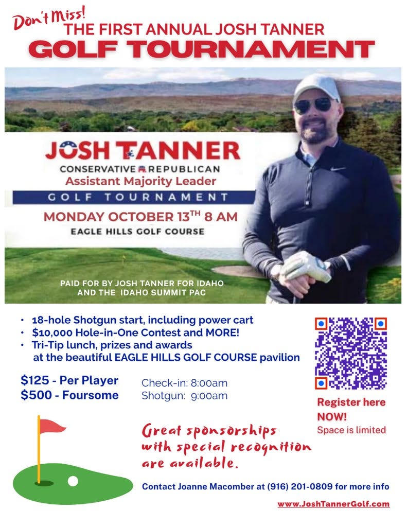 Do you love Idaho, the outdoors, and golf? Then save the date to join me at beautiful Eagle Hills Golf Course on October 13, 2025 for the first ever Josh Tanner Golf Tournament. Tickets are selling out fast so get yours today!